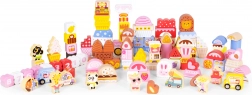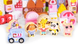 Skab en sød by fuld af isboder, konditorier og charmerende detaljer. Farverige træklodser med tryk af mad, tal og bogstaver understøtter læring gennem leg – børn træner naturligt genkendelse af former, farver og symboler, mens de bygger.