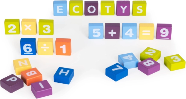 Takket være trykte bogstaver, tal og symboler tilegner børn sig på en legende måde grundlæggende alfabet- og matematikfærdigheder, mens de bygger deres første konstruktioner.