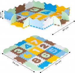 Delene samles som et puslespil og giver mulighed for at skabe forskellige former og en praktisk indhegning, som forhindrer legetøj i at rulle udenfor området. De udtagelige tal understøtter visuel læring, udvikling af finmotorik og fantasi – af delene kan der også bygges simple 3D-konstruktioner som terninger eller tårne.