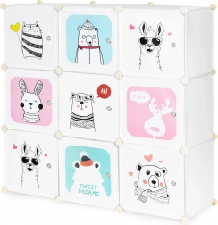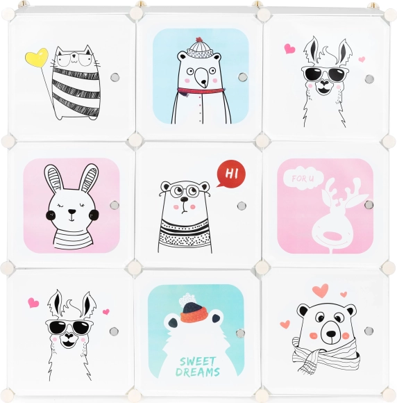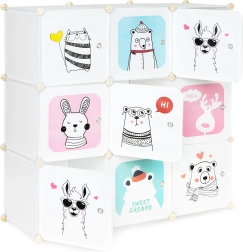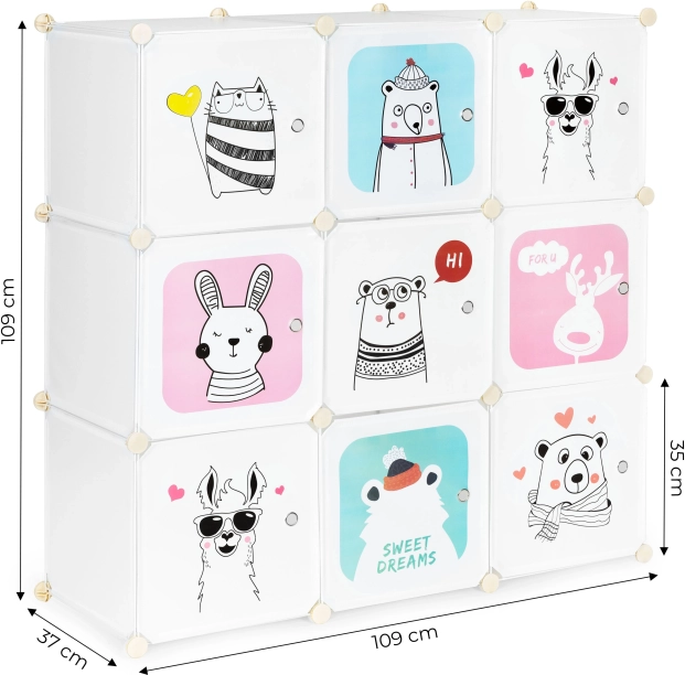 Dette modulære børneskab giver både orden og et legende udtryk til rummet. Ni separate kuber med letåbnede låger rummer legetøj, bøger og tøj, mens farverige dyreillustrationer gør rummet hyggeligt og stimulerer barnets fantasi. Den lette konstruktion er sikker for børn og gør det nemt for dem selv at holde orden.