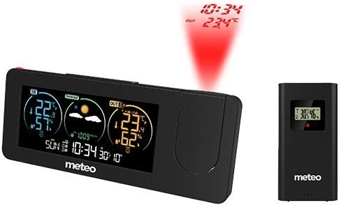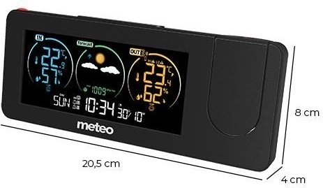 Den digitale vejrstation METEO tilbyder en komplet løsning til måling af temperatur og luftfugtighed både inde og ude. Den er udstyret med en projektor, der viser nøgleoplysninger som tid og temperatur på en valgt overflade i rummet.