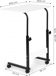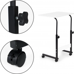 De lodrette ben på bordet har to strammeskruer, der sikrer, at bordet forbliver i den ønskede højde. Hjulene gør det nemt at flytte, og de har en lås for stabilitet.