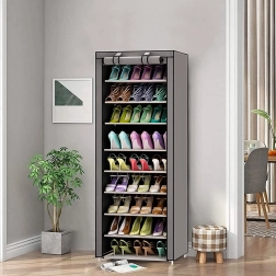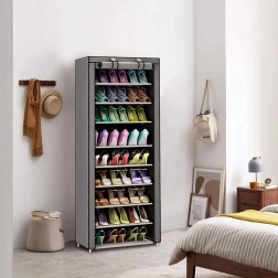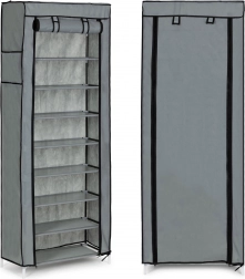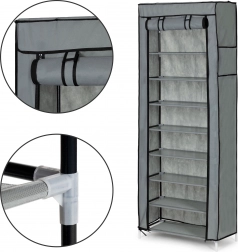 Den stabile ramme af metalrør med plastkoblinger giver hele konstruktionen styrke. Hylderne af slidstærkt tekstil er spændt ud mellem rørene, hvilket øger stivheden og gør opbevaringen bekvem og overskuelig. Takket være afstanden mellem hylderne på ca. 15 cm organiserer du nemt både tøj og fodtøj.