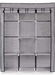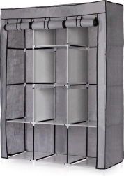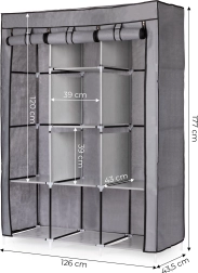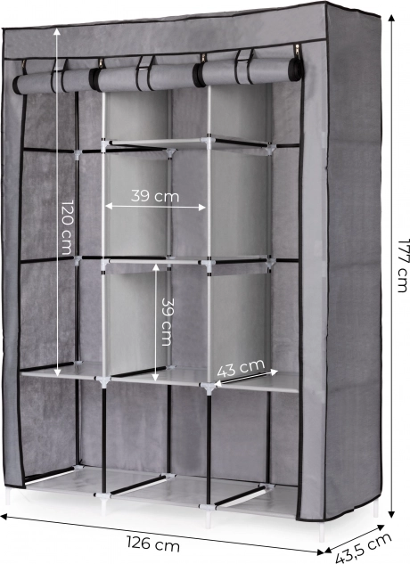 Dette store tekstilskab er et fremragende valg til soveværelset, garderoben og entréen. Det kombinerer hængeplads til skjorter, kjoler og frakker med hylder til sweatre, kasser og sko. Det enkle, alsidige design passer let ind i enhver indretning og giver masser af opbevaringsplads, selv i mindre rum.