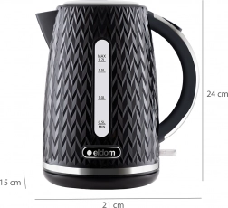 ELDOM C260 Nelo kombinerer elegant sort design med praktiske funktioner til hverdagens bekvemmelighed. Takket være effekten på 2000 W bringer den vandet hurtigt i kog, mens vandstandsmåleren gør det let at påfylde fra 0,5 l. Betjeningen er intuitiv – låget åbnes med en knap ved håndtaget, og den LED-belyste kontakt viser tydeligt, når kedlen er i drift.