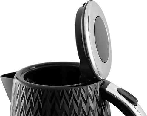 Knap ved håndtaget frigør sikkert det hængslede låg, så du nemt kan fylde kedlen uden at spilde.