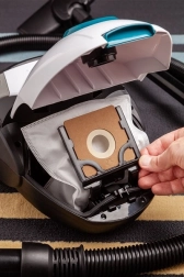 Den praktiske udrustning omfatter indikator for fuld pose, automatisk oprul af 5 m ledning og to rør med en samlet længde på 78 cm for bedre rækkevidde. Universal gulvmundstykke og dobbelt sprække-/børstedyse sikrer effektiv rengøring af alle overfladetyper.