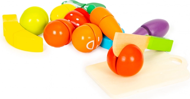 Frugt- og grøntsagsdelene forbindes med velcro, så skæringen på brættet lyder og føles realistisk. Børn kan trygt øve køkkenevner og udvikle fantasien.