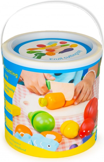 Legesæt for små kokke: træfrugt og grøntsager, der kan skæres og samles igen med velcro. Sættet indeholder en sikker kniv og et skærebræt for realistisk leg. Den praktiske spand med låg gør det nemt at opbevare og tage med. Fantastisk til udvikling af finmotorik og koordination, ideelt fra 3 år.