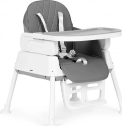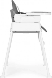 Stolen kan justeres i højden. Du kan nemt fjerne ben og fodstøtte, så den høje stol kan laves om til en lavere stol. Et unikt element er sædet, som kan bruges på en spise- eller køkkenstol. Sættet indeholder særlige stropper til fastgørelse på sæde og ryglæn af en almindelig stol.