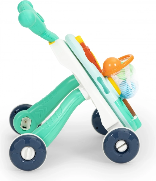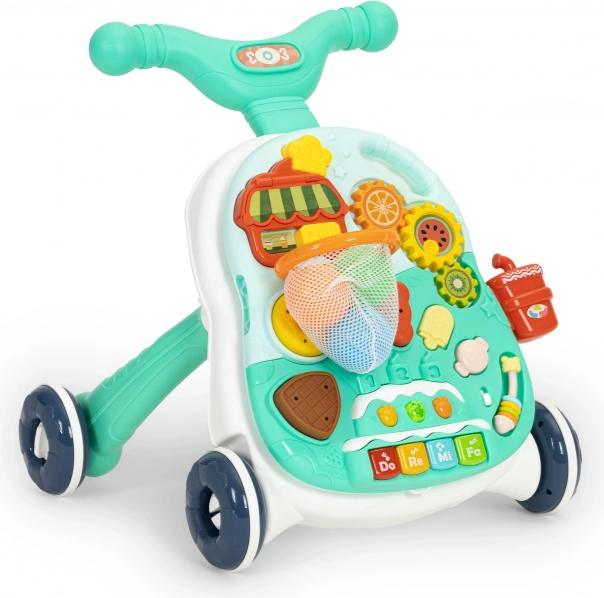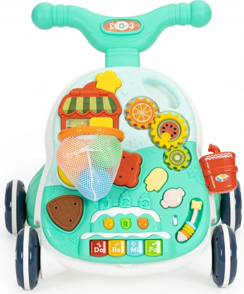 Du skal blot afmontere panelet på fronten af skubbevognen, montere benene og så kan du bruge et funktionelt bord med mange bevægelige elementer. En interessant detalje er det lille klaver, der afspiller lyde og melodier, som helt sikkert hurtigt bliver et favorit-element i legetøjet og giver hvert barn masser af sjov.