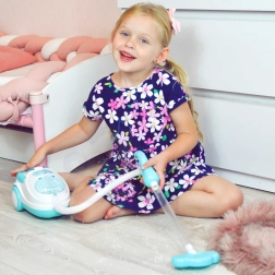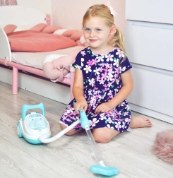 Denne blå-hvide børnestøvsuger efterligner trofast et rigtigt apparat – når den tændes, lyser den, afgiver realistiske lyde, og takket være sugefunktionen kan den suge de medfølgende polystyrenskugler op. Den er perfekt til rolleleg, fremmer ansvarlighed og lærer børn på en legende måde at holde orden.