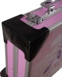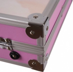 Lyserød kuffert med metal-kanter, -hjørner og -låse holder orden og beskytter materialerne under transport både hjemme og på farten.
