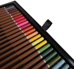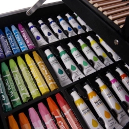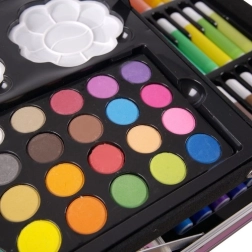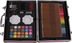 Indholdet er sammensat til at dække forskellige teknikker – fra fin skitsering over markante streger med tusch til dækkende akrylmaling og lette akvarelovergange. Takket være den solide kuffert med metalforstærkninger og låse er transporten sikker og bekvem, uanset om det er hjemme, i skole eller på farten.