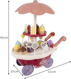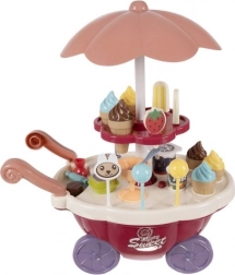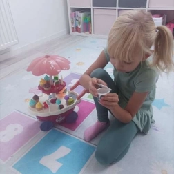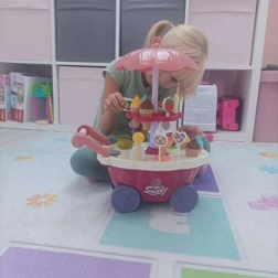 Giv børnene deres egen isbutik! Den farverige isvogn med lys og melodi byder på masser af muligheder for rolleleg som ekspedient. Sættet indeholder kugleis og ispinde, slikkepinde, bæger, ske og “mønter” til at øve betaling. Den roterende etageholder (360°) viser de søde lækkerier flot frem.