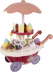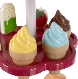 Kugleis, ispinde, slikkepinde, bæger, ske og mønter – alt hvad børn behøver til at lege at sælge, servere og betale, inklusive en 360° roterende udstillingshylde.