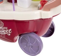 Vognen er lavet af kvalitetsplast, har hjul der kører jævnt, et håndtag til at skubbe med og en dekorativ paraply med belysning. De kompakte mål gør den nem at håndtere både hjemme og på besøg. Legen udvikler fantasi, kommunikation og sociale færdigheder.