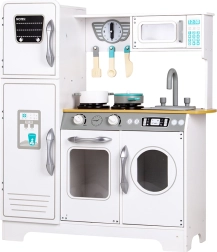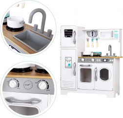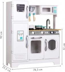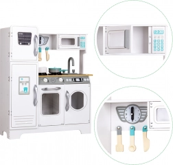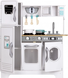 Oplev det robuste hvide ECOTOYS-køkken, der forvandler hvert børneværelse til et lille kulinarisk studio. Med realistiske elementer – fra drejeknapper med lyd til åbningsbare låger og funktionel opbevaring – får børn en autentisk leg med madlavning, bagning og opvask.