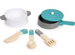 Inkluderer en “vaskemaskine” til rolleleg i hjemmet samt fem trætilbehør: kop, pande med låg, ske, palet og kniv. Alt i sikkert lakeret træ.