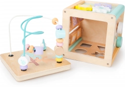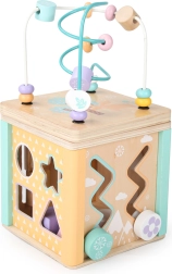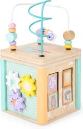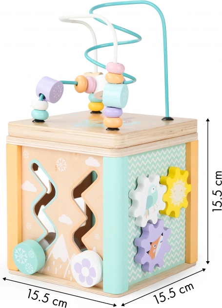 Hver side af terningen tilbyder forskellige legeelementer som labyrint, skydespil eller roterende tandhjul, der understøtter barnets motoriske og kognitive færdigheder.
