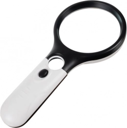 Dette forstørrelsesglas med LED-belysning er designet til komfortabel brug takket være det ergonomiske håndtag, der giver et fast greb. Takket være denne designfunktion er det let at håndtere, hvilket minimerer træthed ved længere brug. Den integrerede LED-belysning er placeret under linsen, hvilket sikrer optimal belysning og forbedret synlighed uden at skabe sideblænding. Denne funktion er særligt nyttig til læsning i dæmpet lys eller til opgaver, der kræver omhyggelig opmærksomhed.