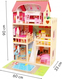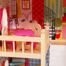 Dukkehusets 3 niveauer og 6 forskellige værelser giver uendelige legescenarier og behagelig leg selv med større dukker.