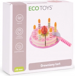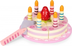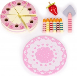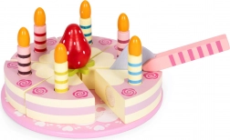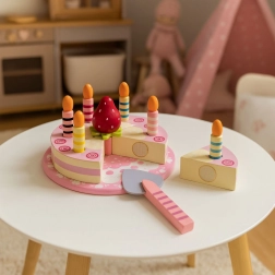 Indhold: rund kage opdelt i stykker, 6 stribede lys, træjordbær, serveringsspade og pyntet tallerken. Alt er lavet af træ og malet med børnesikre farver. Sættet stimulerer rolleleg, træner hånd–øje-koordination og lærer børn at dele og betjene gæster.