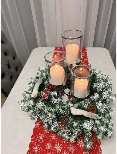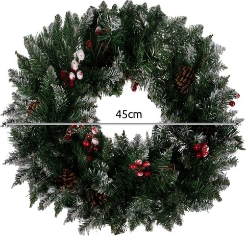 Takket være kunstig sne og kogler bevarer den sit friske udseende længe uden behov for vedligeholdelse. Kransen har fleksible grene, der kan indstilles efter dit ønske. Den er vejrbestandig og kan bruges både indendørs og udendørs.