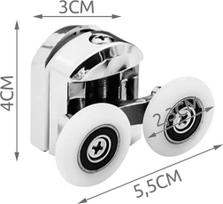 Dette universelle sæt løbere til brusekabiner sikrer jævn gang, pålidelig lukning og mindre slitage på skinnerne. Dobbelthjul på kuglelejer øger glassets stabilitet og reducerer dets vipning. Takket være den vippende konstruktion tilpasser hjulene sig profilens form – velegnet til firkantede og halvrunde hjørner.