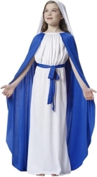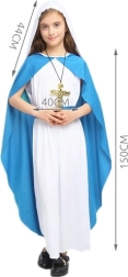 Dette traditionelle Jomfru Maria-kostume består af en lang hvid kjole med blå kappe, som diskret og virkningsfuldt udtrykker figurens beskedenhed og hengivenhed. Takket være let og blød polyester er det behageligt for børn at have på, det strammer ikke og giver fri bevægelighed under optrædener og leg.