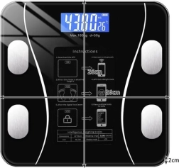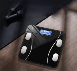 Den smarte badevægt RUHHY med præcis LCD-skærm og Bluetooth-forbindelse måler op til 8 kropsparametre, herunder vægt, BMI, fedt, muskler, vand og knoglemasse. Elegant sort hærdet glas bærer op til 180 kg, og displayet viser også rumtemperatur og batteristatus. Data synkroniseres til den gratis app OKOK International for overskuelig opfølgning på dine fremskridt.