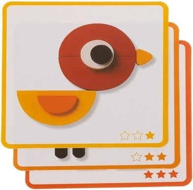 Oplev læring gennem leg. Dette træpuslespil kombinerer geometriske former og livlige farver, så børn nemt kan skabe dyremotiver efter de medfølgende skabeloner. Kortene er markeret med stjerner og guider børn trin for trin gennem tre sværhedsgrader.