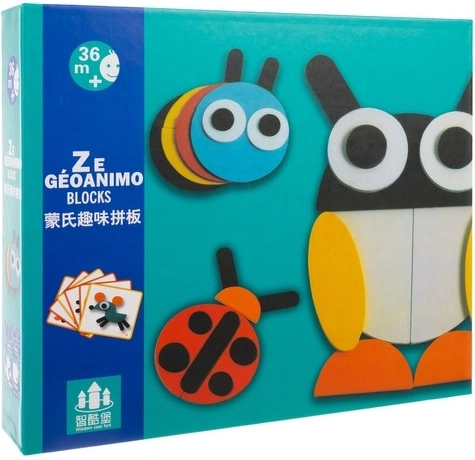 Det farverige træpuslespil med dyr af geometriske former udvikler børns fantasi, kreativitet og finmotorik. Børn lægger efter kort i tre sværhedsgrader og træner derved logisk tænkning, koncentration og tålmodighed. Holdbart træ og en praktisk pose til transport gør den til en varig læringslegetøj til hverdag.