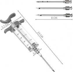 Denne køkkeninjektionssprøjte er ideel til hjemmerøgning, stegning og grill. Den gør det muligt at injicere saltlage, fond og marinader direkte i kødets fibre, hvilket markant forkorter marineringstiden og sikrer jævn saltning og krydring. Det gennemsigtige korpus med ml-skala gør præcis dosering let.