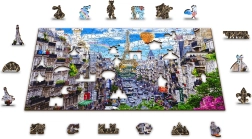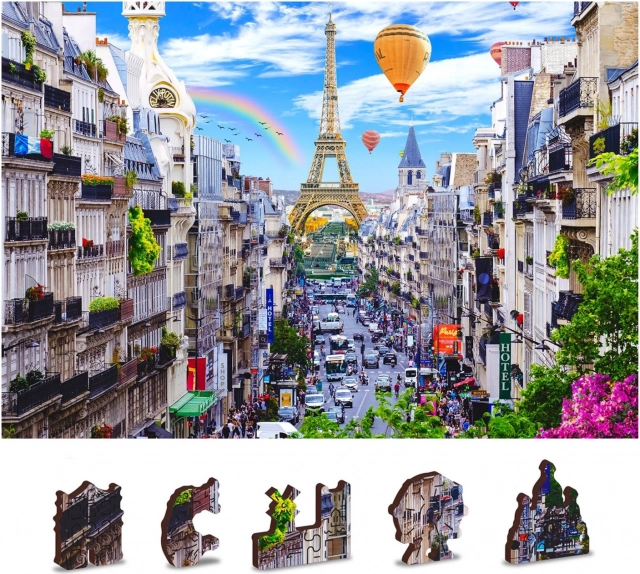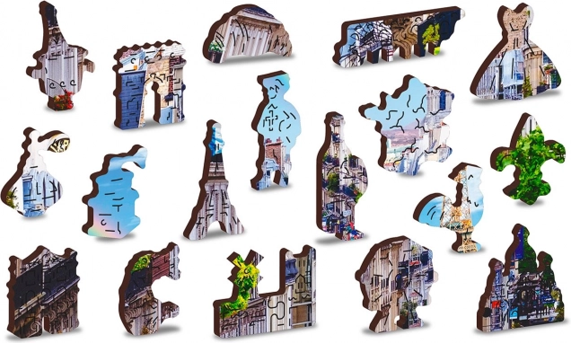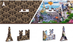 Træpuslespil Travle Paris fra WOODEN CITY er unikt med sin tosidede konstruktion og specialformede brikker, der bringer hele scenen til live under samlingen. Samlingen er mere krævende på grund af de forskellige forme, men også mere underholdende. Det er en udfordring selv for erfarne puslespilsentusiaster.