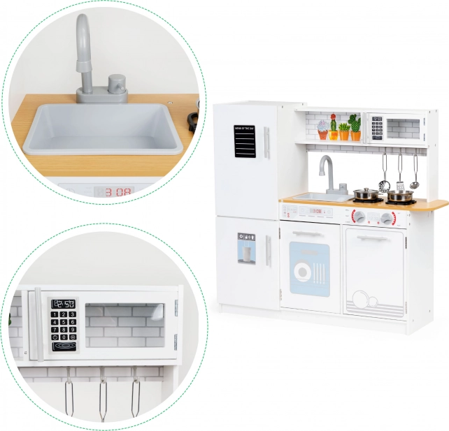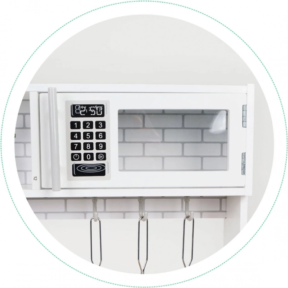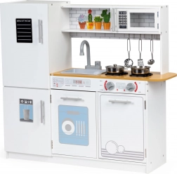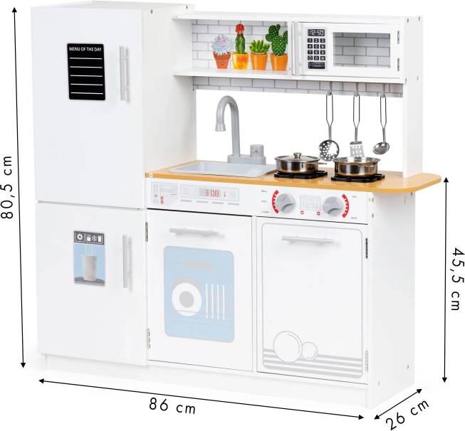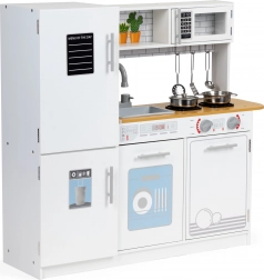 Dette legetøjskøkken tilbyder alt, hvad en lille kok har brug for. Den stabile og robuste konstruktion sikrer sikker leg. Børn vil have det sjovt med drei-knapper, ovn og mikrobølgeovn med åbnelåger samt et rummeligt køleskab med fryser. Med dette køkken kan barnet efterligne voksne kokke og opnå deres første madlavningsfærdigheder.