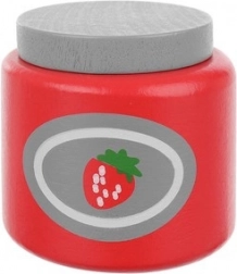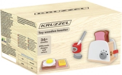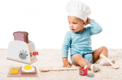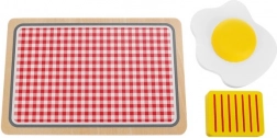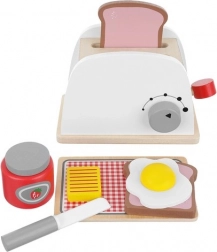 Komplet morgenmadssæt til små kokke: trætoaster, 2 skiver toast, spejlæg, ost, trækniv, glas med marmelade og serveringsbakke. Børn kan lave en realistisk morgenmad, efterligne voksne og opdage former og farver. Naturlige materialer er holdbare og sikre til daglig leg.