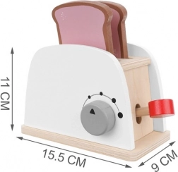 Betjeningen er nem og sjov – den drejelige “temperatur”-regulator og håndtaget starter ristningen, og efter et øjeblik hopper toastene selv op. Sættet støtter fantasien, hånd–øje-koordination og manuelle færdigheder og er et godt træningsredskab før rigtig skæring og madlavning.