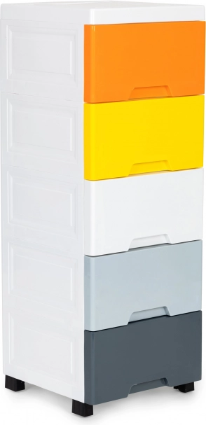 Nyd overskuelig og stilfuld opbevaring af legetøj, kosmetik eller småting. Denne høje og smalle organizer sparer plads, mens fem rummelige skuffer i forskellige farver hjælper med sortering og hurtig genfinding. Den rene hvide ramme passer til moderne interiører og er nem at vedligeholde.