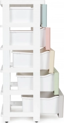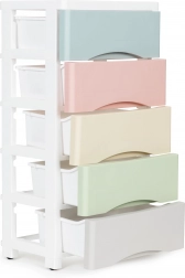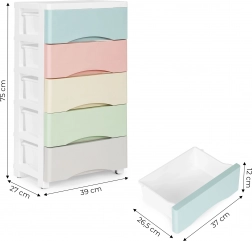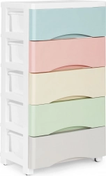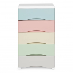Denne kompakte kommode på hjul gør det let at organisere kosmetik, legetøj, kontorartikler og småting i hjemmet. Fem rummelige skuffer i pastelfarver giver masser af plads, og takket være integrerede håndtag trækkes de let ud. Den hvide ramme virker ren og passer til moderne interiører.