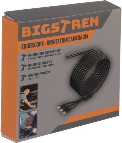 Det kompakte endoskopkamera BIGSTREN til telefoner tilbyder Full HD (1920×1080)-billede, 2 m halvbøjeligt kabel, 8 justerbare LED og udskiftelige tilbehør (krog, magnet, spejl). Takket være IP67-vandtæthed og bred kompatibilitet med Android og iOS via ANESOK-appen kan du nemt inspicere rør, motorrum og svært tilgængelige steder.