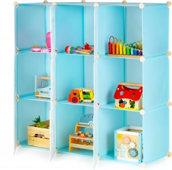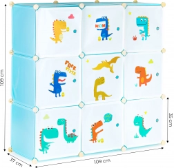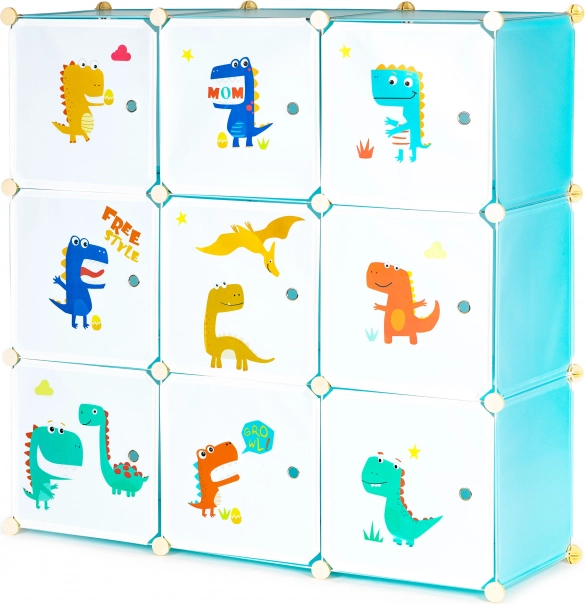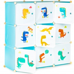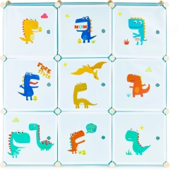Denne modulære garderobe til børneværelset kombinerer sjovt design med daglig funktionalitet. Ni lukkede kuber med farverige dinosaurtryk skaber overblik i opbevaringen og motiverer børn til selv at holde orden. Takket være holdbare polypropylenpaneler og en forstærket metalramme er skabet let, men stabilt.