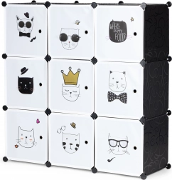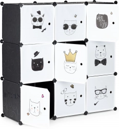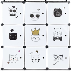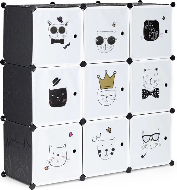 Låger med legende kattemotiver giver liv til børneværelset og motiverer børn til selv at holde orden. Monteringen er meget enkel takket være stærke ABS-forbindelser – skabet samles på ingen tid og kan altid ombygges.