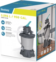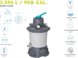 Med en kapacitet på 3596 l/t er pumpen ideel til pools med et volumen fra 1.100 til 18.100 liter. Til drift kræves sandfyldning (kvartssand #20, kornstørrelse 0,45–0,85 mm, ca. 8,5 kg) eller højtydende filterkugler Polysphere™ på ca. 240 g.