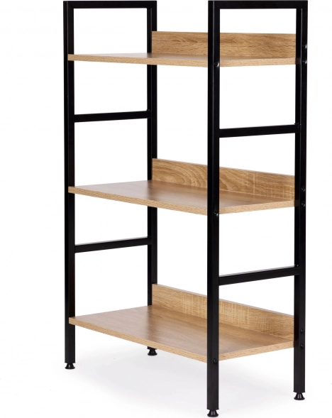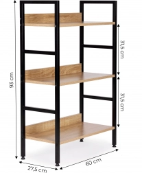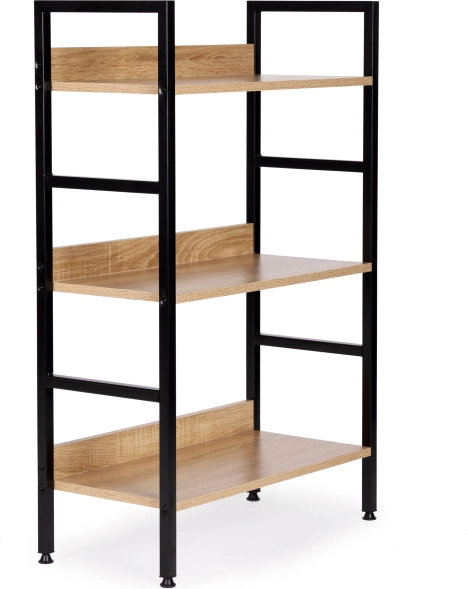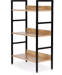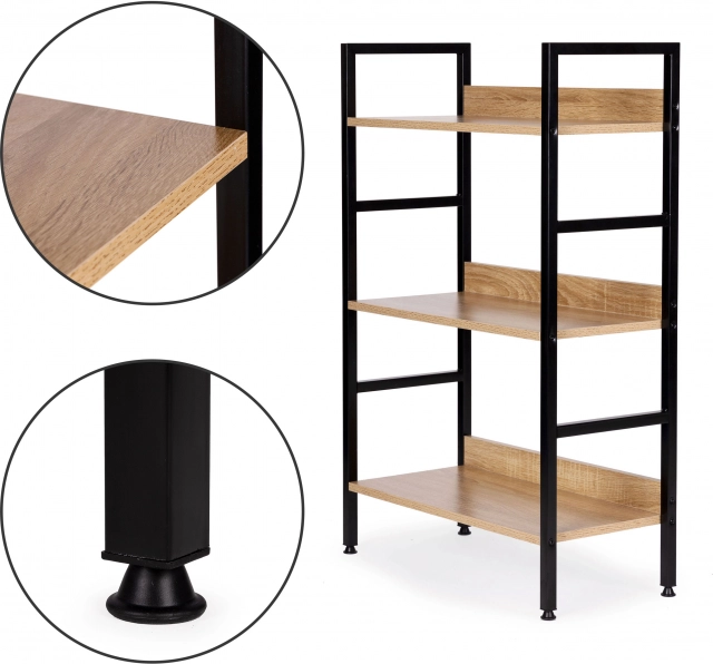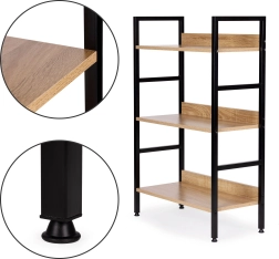 Stilfuld hylde i loftstil med tre niveauer, der byder på moderne design, stabil metalkonstruktion og alsidig anvendelse i stue, soveværelse, entré og badeværelse. KvalitetsMDF-plader med trædekor på en robust pulverlakeret ramme, justerbare fødder med gulvbeskyttelse og nem montering gør den til en ideel opbevaringsløsning til dekorationer, bøger og planter.