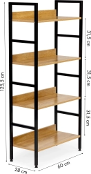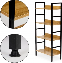 Loftreolen MODERNHOME forener moderne look med praktisk opbevaringsplads. Træhylder på 60 × 28 cm rummer bøger, dekorationer, planter og badeværelsestilbehør. Metalkonstruktionen sikrer stabilitet og lang levetid, mens beskyttelsespuder og højdejusterbare fødder beskytter gulvet og udligner ujævnheder.