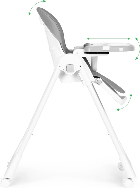 Ryglænet kan reguleres fra opret til hvileposition, den justerbare fodstøtte og den forskydelige bakke gør det nemt at tilpasse højstolen til barnets højde og alder.