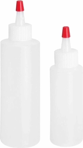 Sæt med to flasker til dekoration af kager og desserter. Beholdere i forskellige størrelser er ideelle til pyntning af konditorvarer. Det fleksible design og de smalle halse gør arbejdet betydeligt lettere. Funktionelle låg forhindrer, at glasuren tørrer ud for tidligt. De er lavet af holdbar plast, som sikrer lang og problemfri brug.
