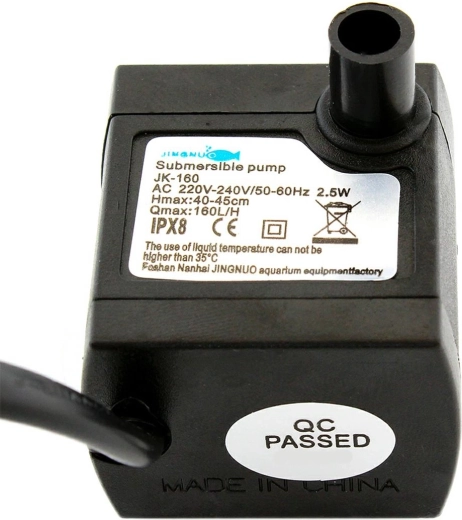 Luftpumpe til akvarier med kapacitet op til 160 liter vand i timen. Enheden letter vandcirkulation og iltning, hvilket muliggør fjernelse af skadelige gasser fra vandet og bedre betingelser for vækst af fisk og planter. Pumpen er meget støjsvag og bruger minimalt med elektricitet (kun 2,5 W).