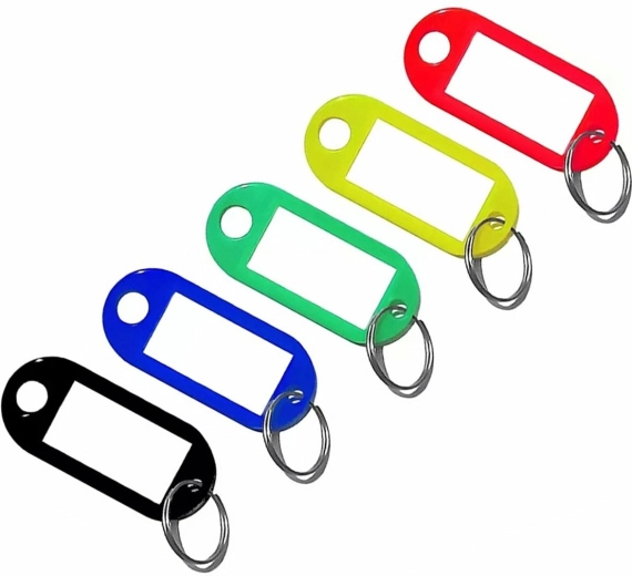 Sæt med 100 nøgleringe med ID‑mærkat. Alle nøgleringe har en metalring til fastgørelse af nøgler og et vindue med et udtageligt kort til beskrivelse. Det gør det nemt og hurtigt at finde de rigtige nøgler. Et ekstra hul gør det muligt at hænge nøgleringen på en krog.
